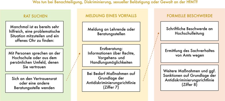 It is important to the University of Music and Drama that staff, students and guests treat each other fairly and respectfully. The conditions of artistic and academic education with its large proportion of individual and small group lessons, personal dependence on the teacher, high pressure to perform and the commitment of the whole person require particularly sensitive interaction with one another.